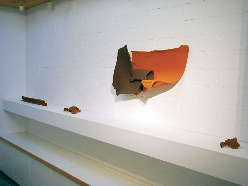 Gruppenausstellung bei "Par Terre" in Attenweiler/Oberschwaben, gemeinsam mit Klaus Schultze, Nica Haug, Abi Shek, Sabine Kratzer, Marlis Glaser und Thomas Bohle. Im Vordergrund Gefäße von Thomas Bohle, im Hintergrund Faltungen von Bernd Fischer